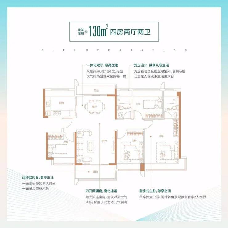 130㎡的4房2厅2卫,设计的是竖厅南北通透格局,客厅4.1米开间,一体化双厅双阳台,四开间朝南,主卧270°转角飘窗大套间设计,U型厨房,卫生间干湿分离,得房率:78.43%(不含赠送),阳台主朝东南向。