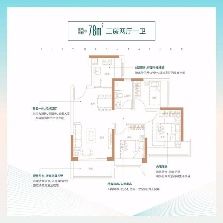 78㎡的3房2厅1卫,设计的是经典竖厅格局,客厅3.4米开间,LDKB一体化,动静分区,三开间朝南,主卧270°转角飘窗,L型厨房,卫生间干湿分离,得房率:74.71%(不含赠送),西南或东北朝向。
