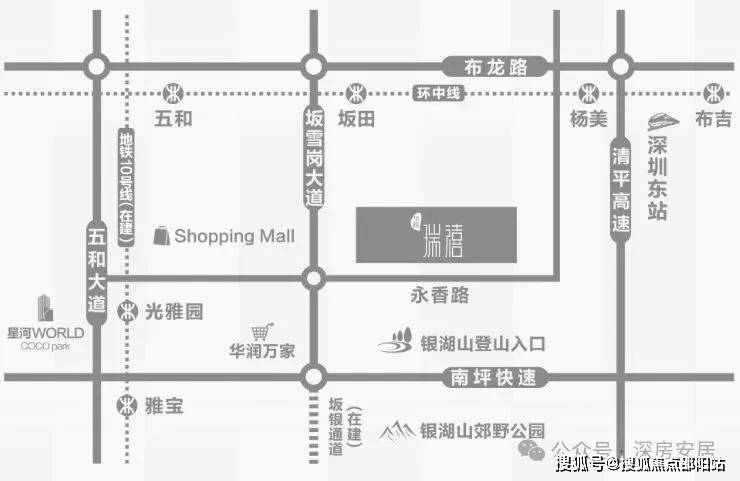 交通配套:距离地铁5号线坂田站A出口约800米,距离10号线光雅园站约1公里。项目地处坂银通道首排,约12分钟可直达福田中心区,周边还有布龙路、南坪快速等“两横四纵”交通路网。