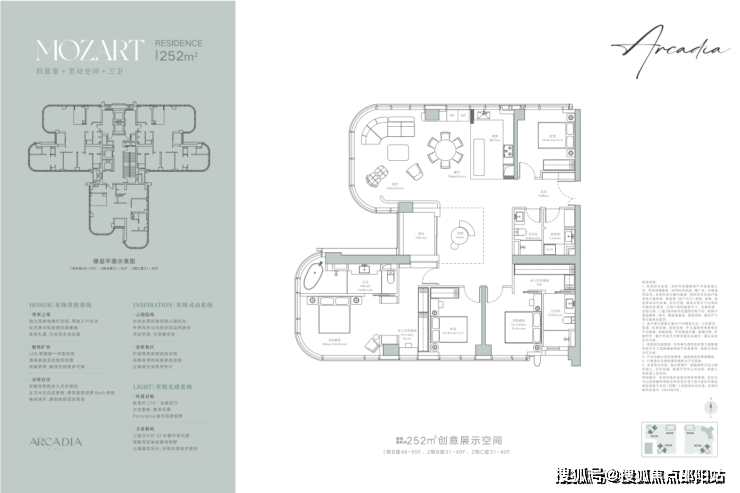 建面约252㎡户型是四居室+灵动空间+三卫,客厅和主卧套房均打造约270°全景视野, 将周边景观资源直接引入室内,创造“有限空间见无限景观”的效果。