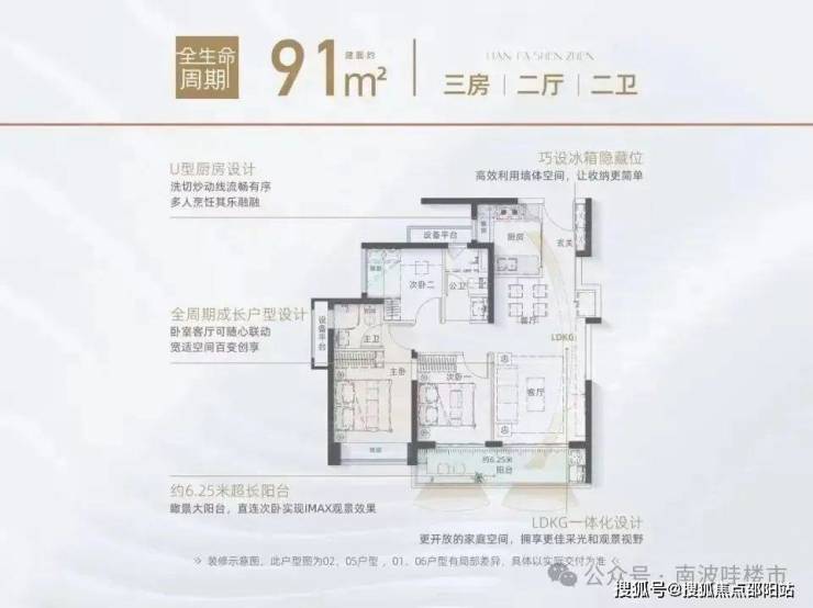 91㎡户型特点:竖厅三开间朝南,客厅开间3.5米,卧室宽度分别为3米、2.75米、2.25米,U型厨房设计,南向超长阳台约6.25米。