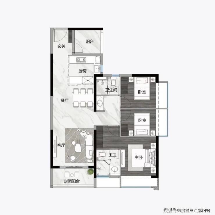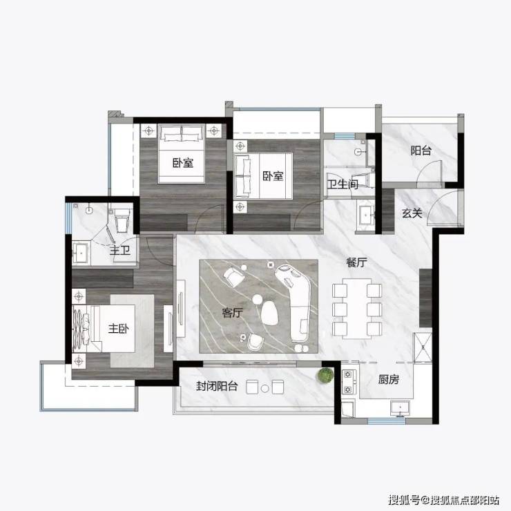 112㎡ 3+1房2厅2卫,两梯四户南向低密度,LDKB一体化设计,全屋80cm阔景飘窗升级。