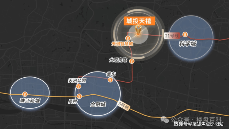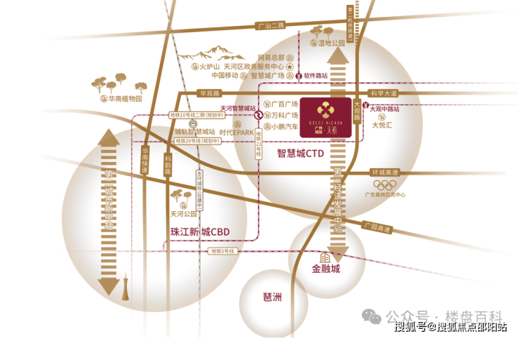 位于广州市天河区华观路和大观中路交汇处,广州地铁21号线天河智慧城站附近;坐落天河智慧城CTD,广州第三经济发展中轴核芯,与珠江新城CBD共同构成“一区双核”的发展格局,将成为广州新的经济增长极。