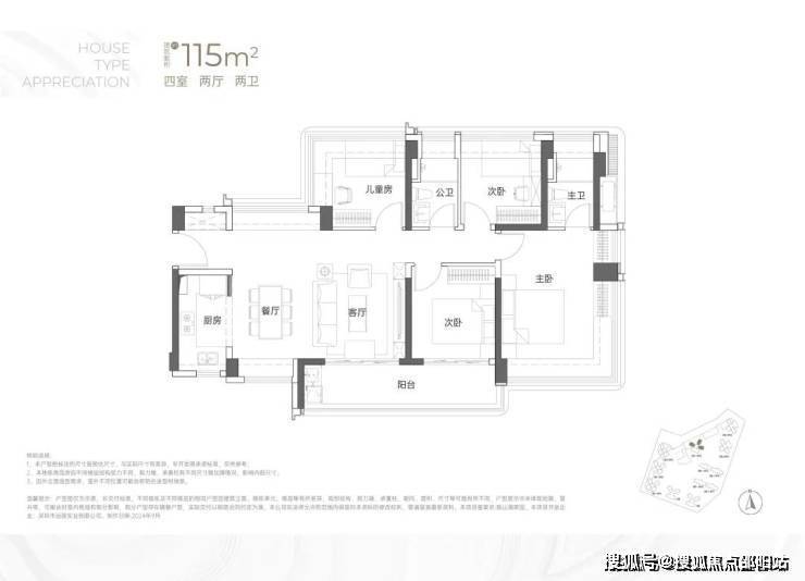 115㎡的4房2厅2卫户型分布于1/2栋,东南、西南朝向,横厅户型但是能做到南北通,赠送率最高的户型,2栋1单元户型差异这在阳台位置的设置上;