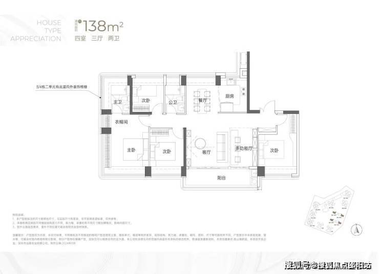竖庭格局,西南向,基本居住功能与建面约108-110㎡4房2卫一致,但格局不一样,从目前公布的户型图上看,主要是主卧空间有了更大的提升,比如可以放更大一点的衣柜。但从位置上看,它所在的楼栋更靠近主干道,会有噪音影响。