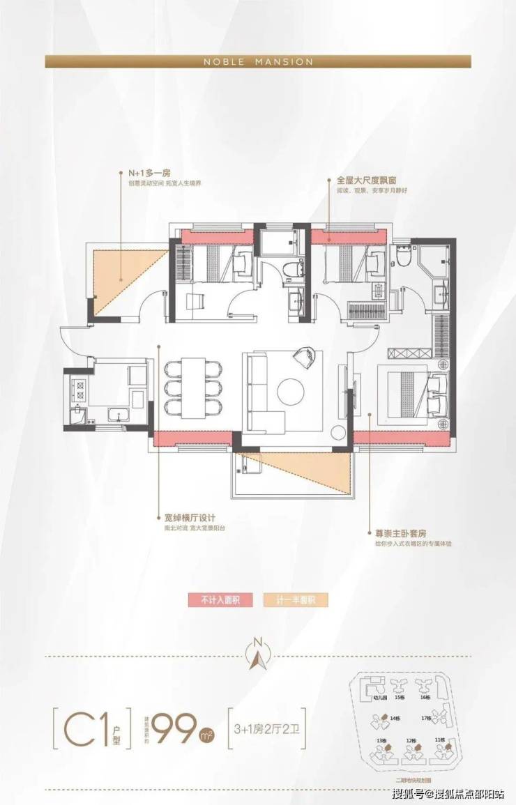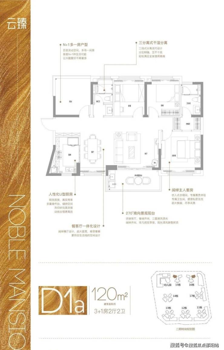 建面约120㎡,3+1房2厅2卫,单边,宽景横厅,南北对流舒适四房 ,宽景横厅设计,超大空间,雍容奢雅,4.5 米270°南向景观阳台,步入式主卧衣帽间,专属尊贵体验 。