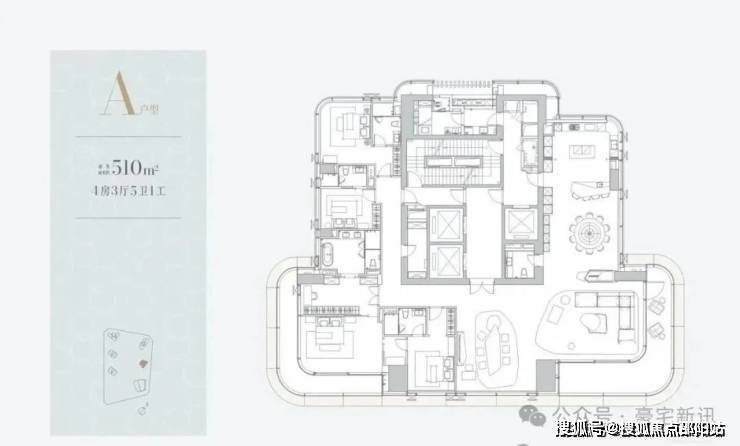 1A栋(1栋一单元)-43层:3梯1户,约510㎡,一层一户,私密性极致,为项目旗舰户型。