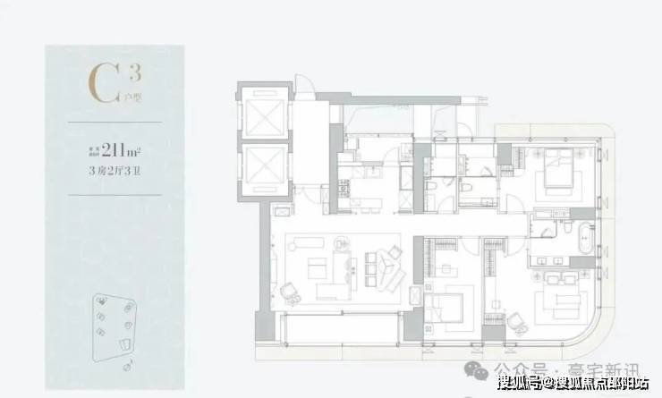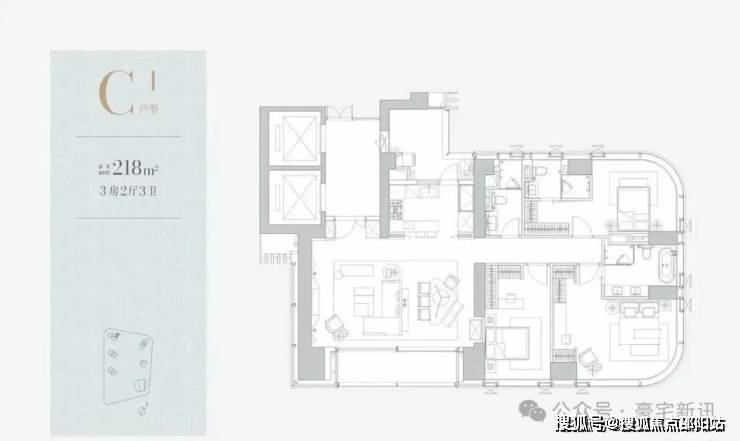 1C栋(1栋三单元)-51层:4梯3户,约210㎡,为一期的入门级户型,一层三户。