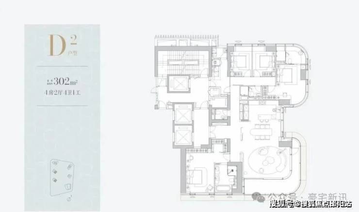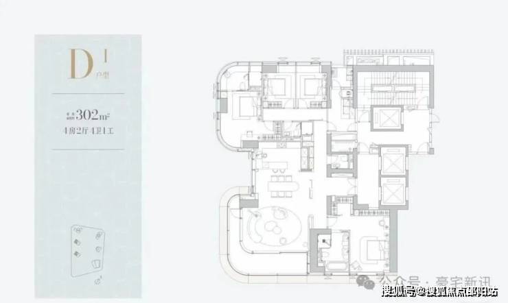 1D栋(1栋四单元)-45层:均为3梯2户,约305㎡,一层两户。