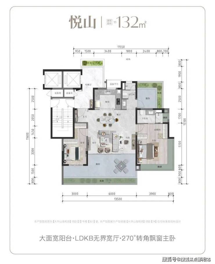 建面132㎡悦山户型:LDKB无界宽厅设计,大面宽阳台延伸生活空间,主卧270°转角飘窗,最大化吸纳山海景观。