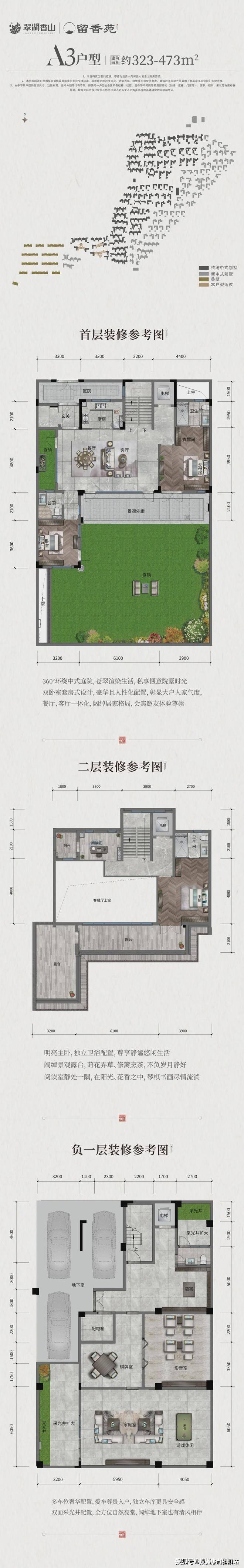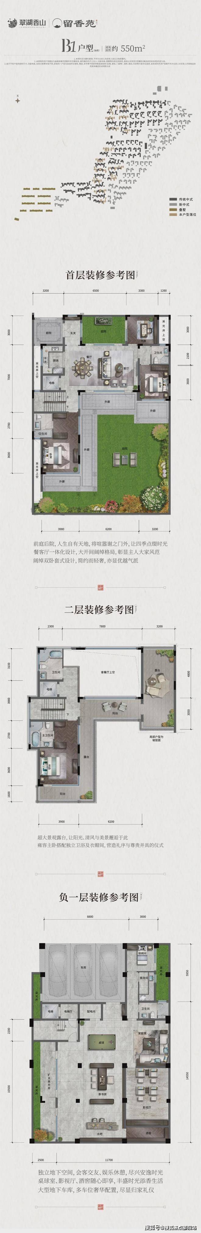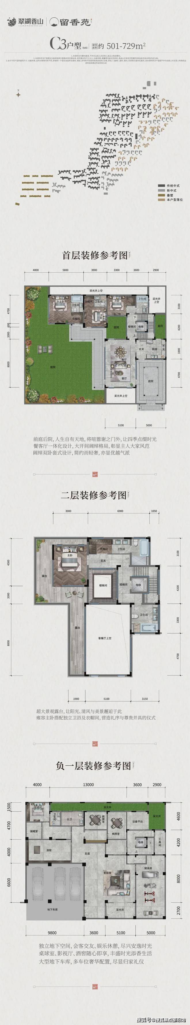 合院别墅(315-679㎡):融合玻璃系统窗、挑檐灰空间等设计,兼顾采光与私密性,地下室挑高会客厅尽显奢华