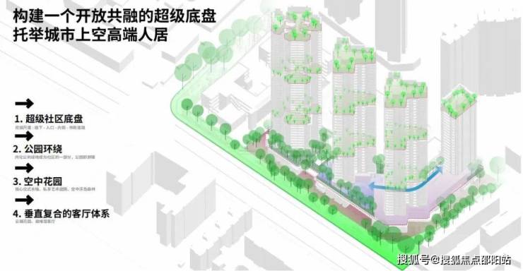 针对地块用地集约、需求多元的特性,设计摒弃传统平面布局思维,构建“立体底盘 + 空中休憩场域 + 人居空间”的三维空间体系。通过空间的垂直分区规划,实现公共场景与私密领域的有序衔接,地面层强化公共开放属性与城市配套的融合,上层空间营造静谧舒适的居住氛围,达成“城市烟火与私密生活”的和谐共生,让每一层级空间都承载独特的人居价值。
