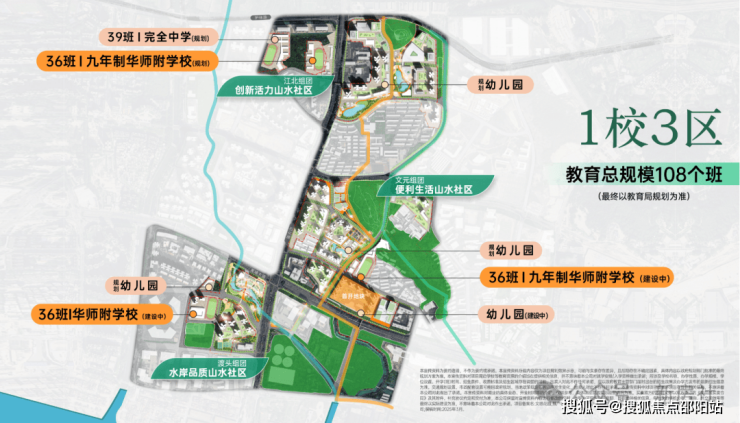 江北组团,配备一所36班的9年一贯制和39班的初高中