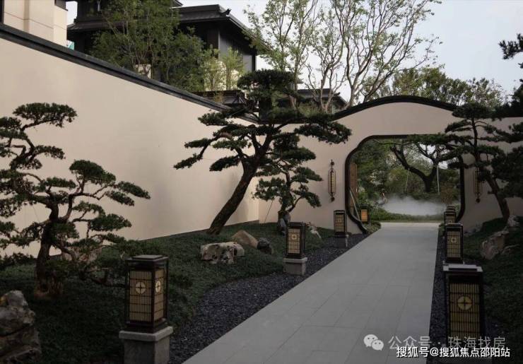 园林选用大树、特选老桩等在入园提升价值感,厚重的额绿荫结合热带。风情打造岭南特色诗意情境,凸显典藏级府邸厚重、尊贵的底蕴。