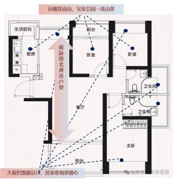 三阳台:前海黄金圈内,唯一在售89㎡三房两卫三阳台,客厅阳台进深2米,堪比140㎡大户型阳台