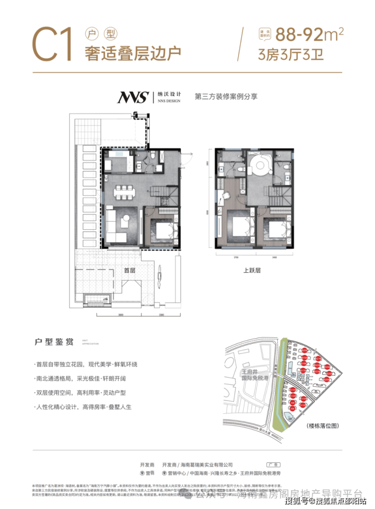 项目位于万宁兴隆温泉旅游度假区、万宁市区及滨海湾区三大板块交汇处,环岛交通便捷通达,超约10万㎡王府井国际免税港仅一路之隔,集购物、特色美食街、时尚服装、约3500㎡新浦森精品超市、儿童游乐中心于一体,近享全球好物。项目周边生活配套齐全,百米内加油站、风情早市街、便民农贸市场、小学及幼儿园,一站式满足日常生活需求。项目拟规划用地面积约437亩,计划分三期开发,项目目前在售一期地块,产品涵盖舒适平层、奢适叠层、奢阔独栋等多种形态,可满足不同人群的置业度假需求。