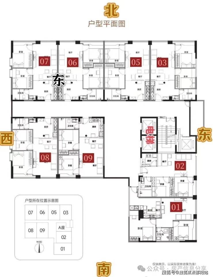 A座3梯8户,内走廊布局,朝向上朝东、朝南以及朝北向都有,全部为一个面积,户内布局基本上完全一样,差异在端头位次卧可以采光。