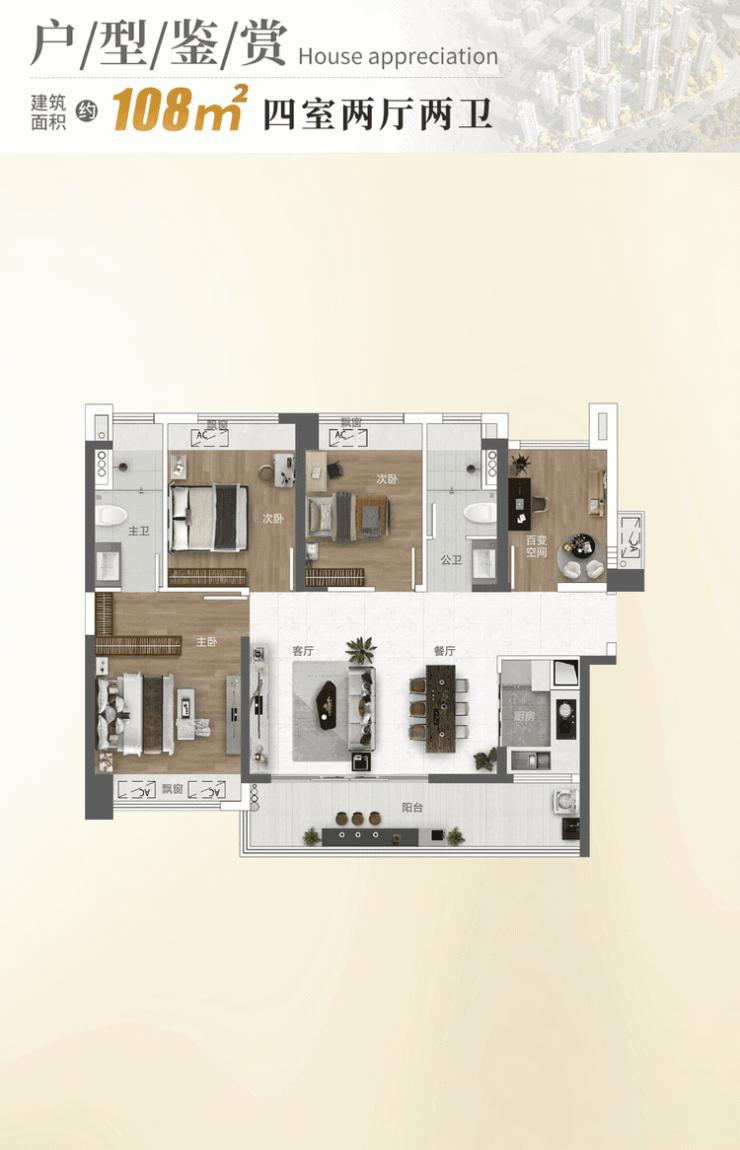 该户型最大亮点是竟然做到了双卫、阳台+花池。一面阳台观景,一面花池多功能空间利用,小面积也能拥有优雅生活。
