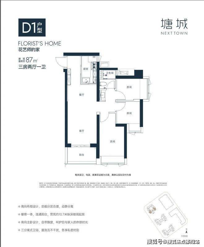 87㎡3房D1户型:位于5栋1单元01、04梯腿,东南朝向,竖厅格局,客厅3.3米开间,餐客厅一体化设计,约10.7米纵深,南向主卧约10.5㎡,阳台约5.5㎡,得房率约80%。