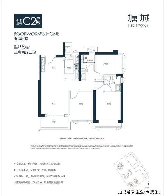 96㎡3房C2户型:位于5栋4/5单元02梯腿,东北/西南朝向,竖厅格局,客厅3.3米开间,餐客厅一体化设计,格局方正,U型厨房,主卧套间约16㎡,观景阳台约5㎡,得房率约80%。