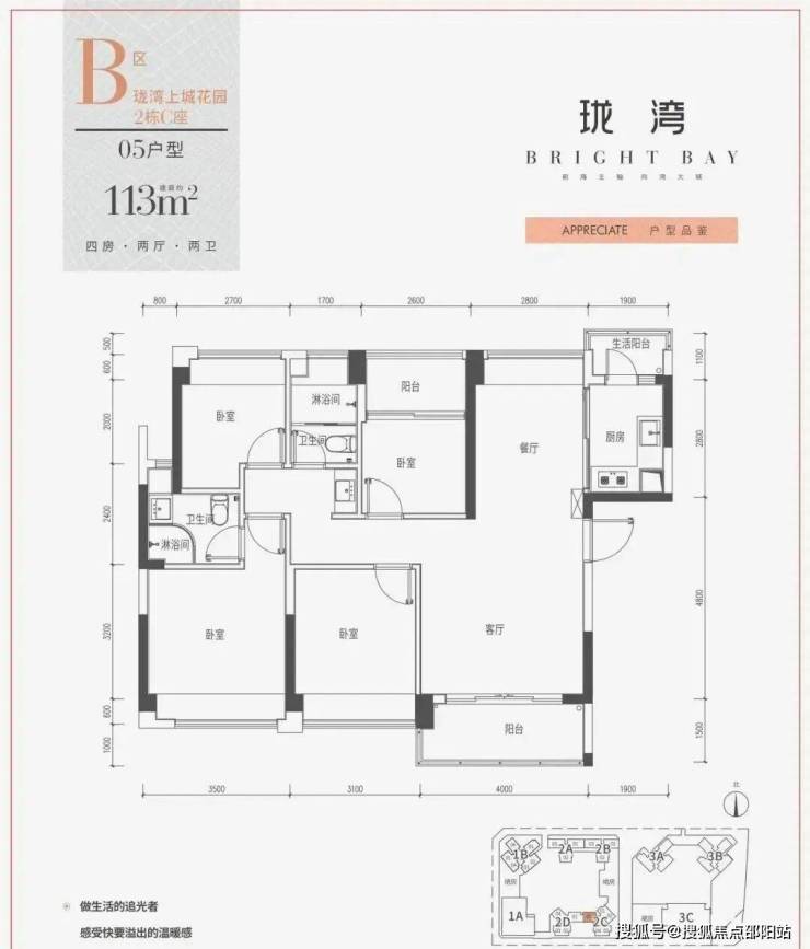 建筑面积约113㎡四房两厅两卫,稀缺南北通透,三阳台设计,约4米阔景大阳台。