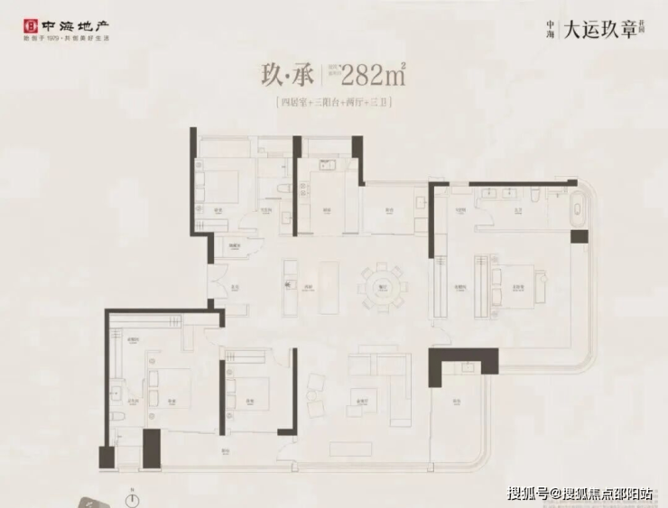 282m²的4房2厅3卫3阳台,设计的是竖厅格局,客厅6.2米开间,LDKB大方厅设计,2梯2户,尊享专梯专户,私享超大入户公区,五开间朝南,主卧270°无柱转角飘窗,双套房设计均配置衣帽间,中西双厨房,主卫配置浴缸,得房率约90.6%(包含赠送),不含电梯入户,南北双阳台,小阳台看大运公园山景,大阳台东南朝向,俯瞰整个大运中心。