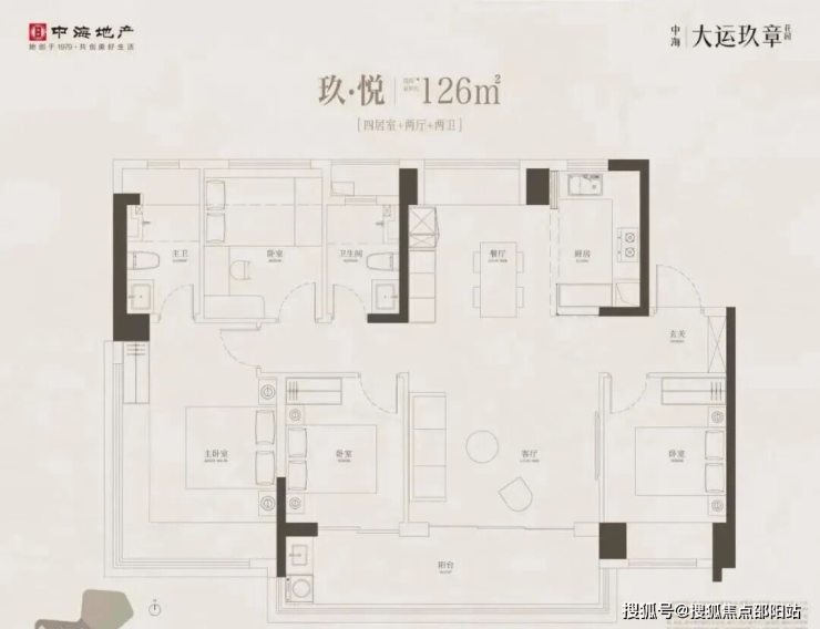 126m²的4房2厅2卫,设计的是竖厅南北通透格局,进门入户玄关,客厅4.3米开间,餐客厅分离设计,四开间朝南,全屋八面飘窗,主卧做到了270度转角无柱飘窗,U型厨房,卫生间干湿分离,得房率约95.2%(包含赠送),客厅连接次卧出7.1米长的观景大阳台,全部主朝西南向,看大运公园景观。