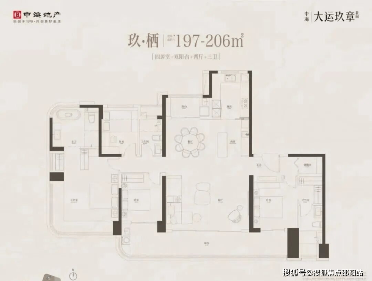 197-206m²的4房2厅3卫2阳台,设计的是竖厅格局,客厅6.1米开间,LDKB大方厅设计,2梯2户,尊享专梯专户,私享入户公区,进门配置储物间,五开间朝南,主卧270°无柱转角飘窗,双套房设计,中西双厨房,主卫配置浴缸,得房率约94.6%(包含赠送),不含电梯入户,南北双阳台,小阳台看大运公园山景,客厅连接2个次卧出超大观景大阳台,东南朝向,俯瞰整个大运中心。