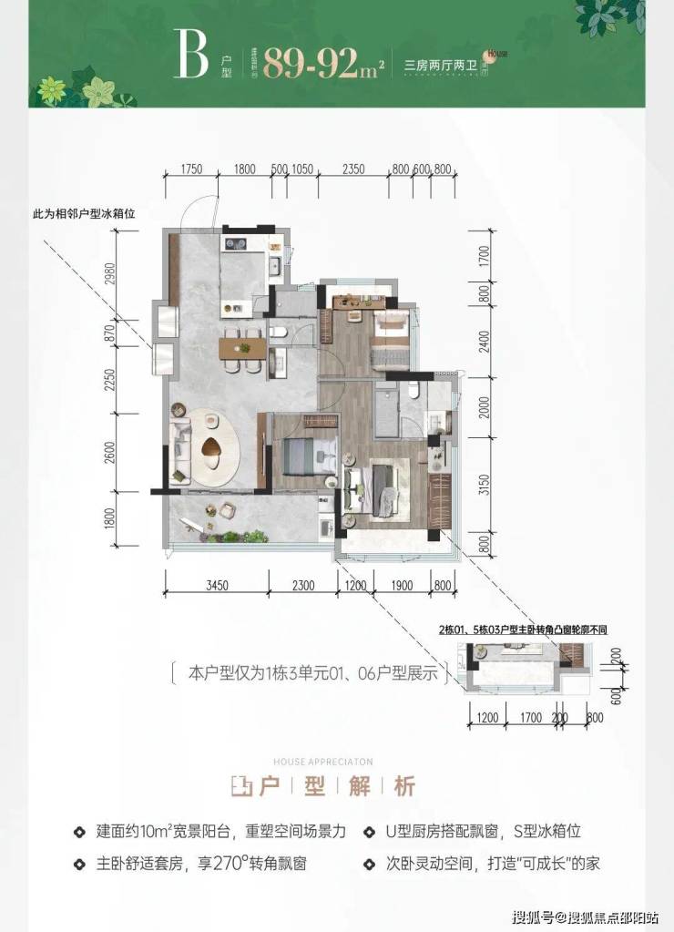 🏆91㎡三房二卫(竖厅):双面L型主卧飘窗,折后370-410万