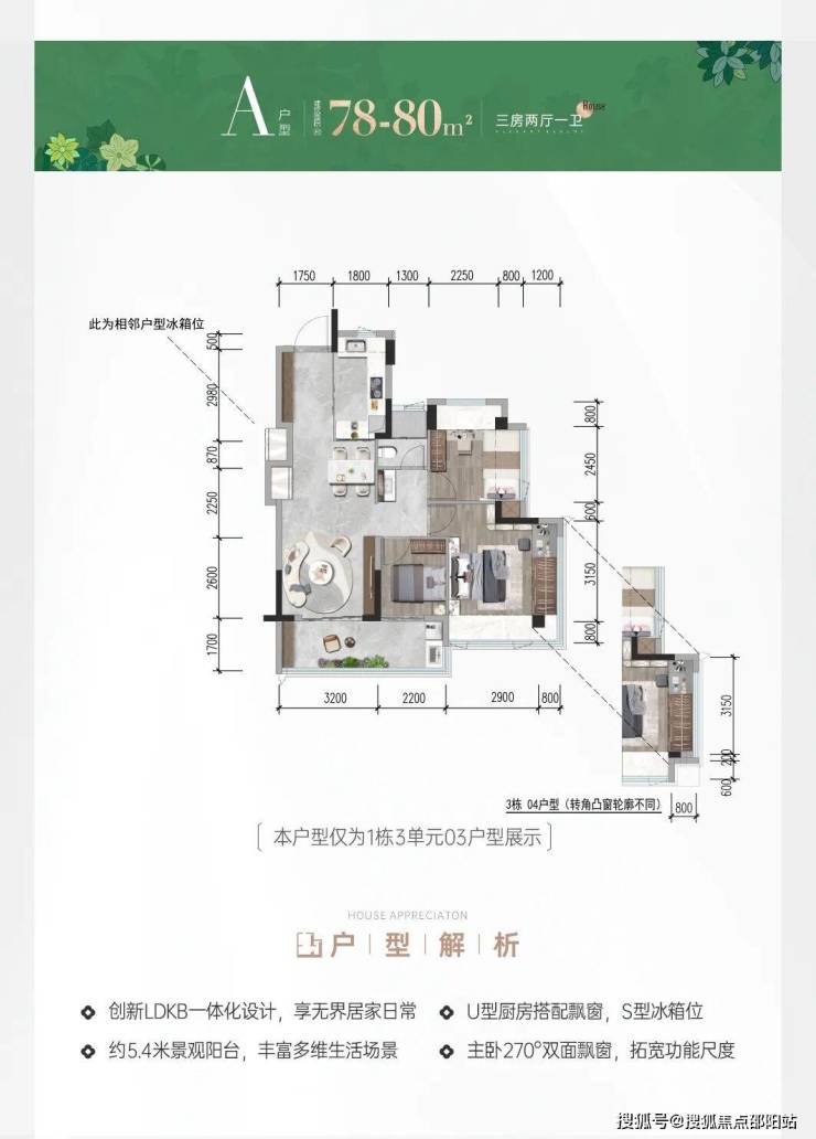 🏆80㎡三房一卫:约5.4m宽境阳台,三开间向阳,折后340-370W