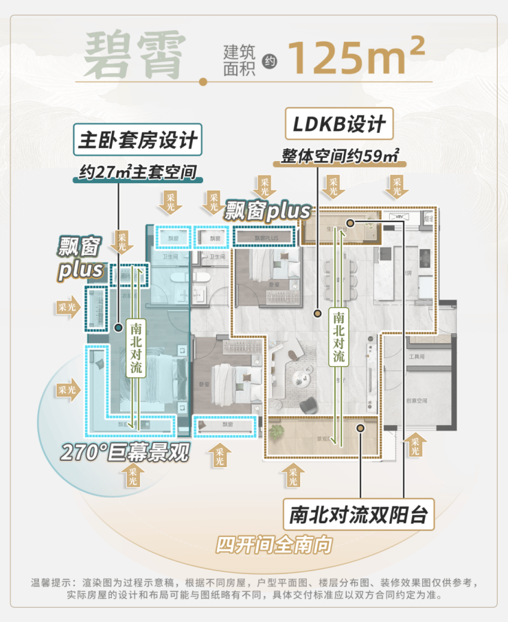 125㎡南北对流四房户型,双阳台设计,餐客厅开间比同面积段都要宽,主卧也是能做到南北对流。
