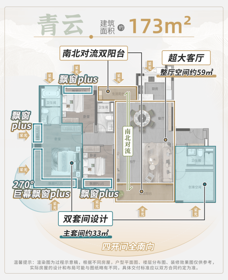 143㎡南北对流四房,是125㎡的放大版,每个空间都更加阔绰些,而且主卧还有一个步入式的衣帽间。