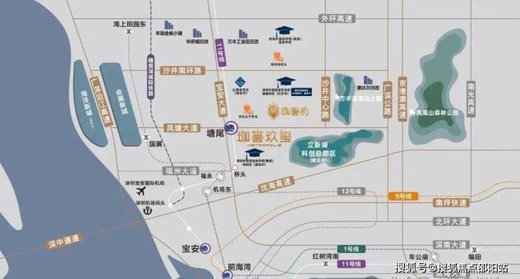 项目位于沙井新桥,珈誉府本身是一个大型综合体,自身配套丰富,自带50万㎡大型商业;地铁11号线塘尾站挨着项目,深圳外国语宝安学校在项目南北两侧,且靠近万丰湖、立新湖,有生态资源。