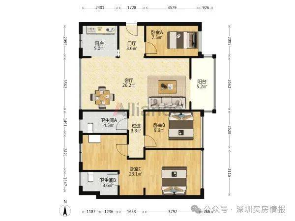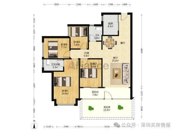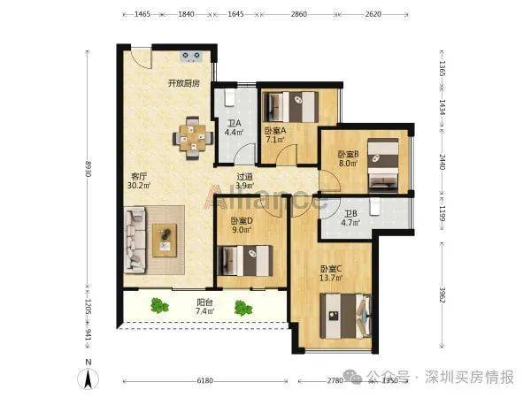 3、户型设计很好,115㎡做四房,户户阳台朝南