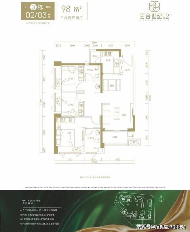 3栋02/03户型,设计的是竖厅格局,进门入户玄关客厅3.5米开间,LDKB一体化设计,三开间朝南,动静分区,正南朝向。