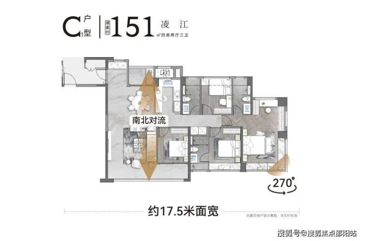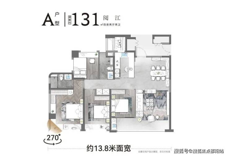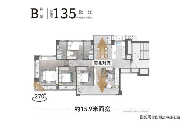 四开间朝南,南向采光面达到13.4米,其中景观阳台连通次卧,面宽达到6.5米。主人房设计转角L型大飘窗,呈现270°环幕视野,北向次卧也有双面采光。B户型:135㎡四房两厅两卫