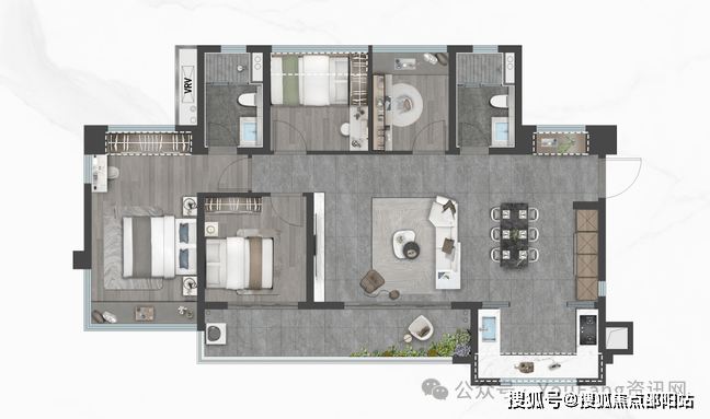 御峯:建面约120㎡,四室两厅2卫,270°转角飘窗,宽境主卧套房