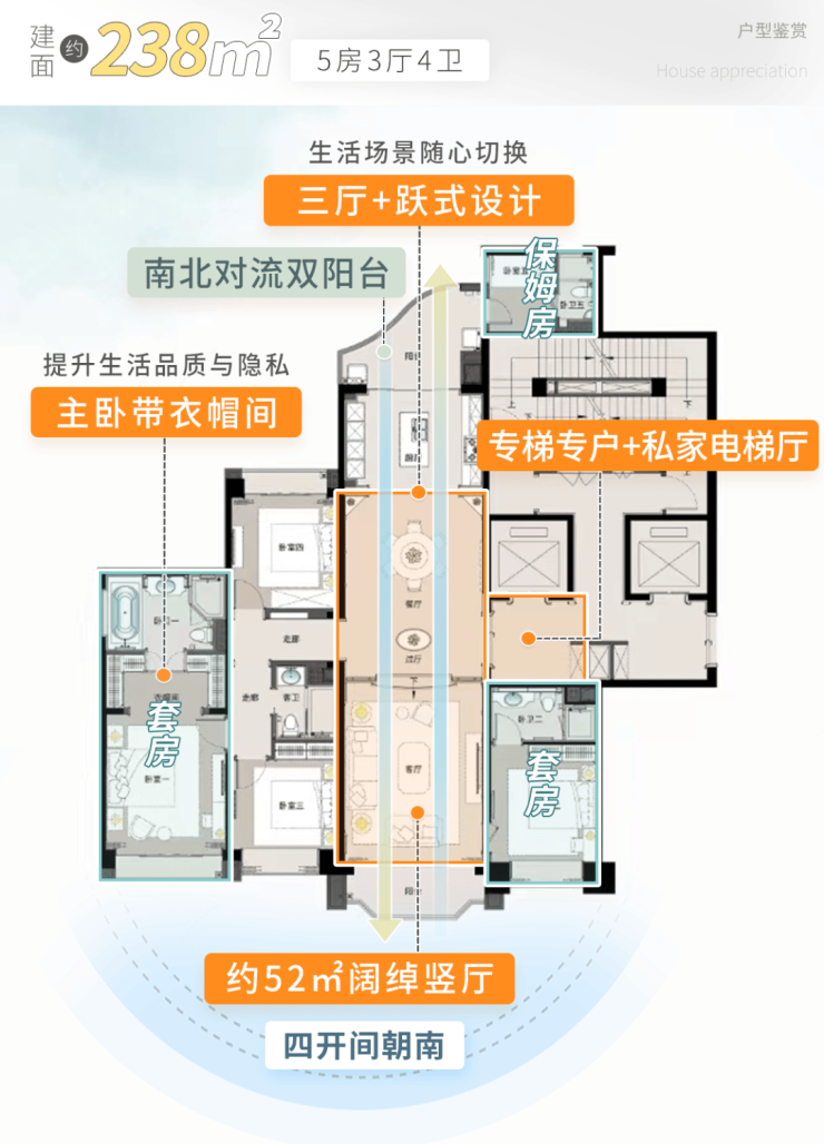 建面约238㎡、267㎡户型,直接做到两梯两户大平层,走出电梯,便是你专属电梯间!