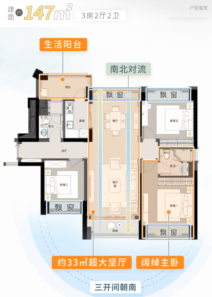 另外,建面约130㎡、147㎡户型,也延续了双阳台、大飘窗、全南向等大平层的优点,采光面、舒适度,都达到了一个高度。