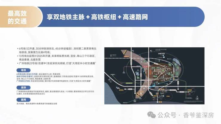 项目周边交通网络发达,1 高铁 + 2 地铁 + 3 高速的交通格局,让出行变得无比便捷。地铁 6 号线已开通,13 号线在建,广深港高铁光明城站、赣深高铁以及未来的莞深城际在此交汇,龙大高速、南光高速两大免费高速可快速通达全城。无论是商务出行,还是日常通勤,都能轻松实现,强大的交通优势将吸引大量人群聚集,为公寓的租赁市场提供了广阔的前景。