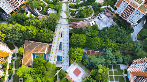 园林打造上也花了很多心思,比如整体抬高了约5米,隔绝了外部的喧嚣,实现“大隐隐于市”,环形艺廊也连通整个社区,业主平时在这里散步很有松弛感。