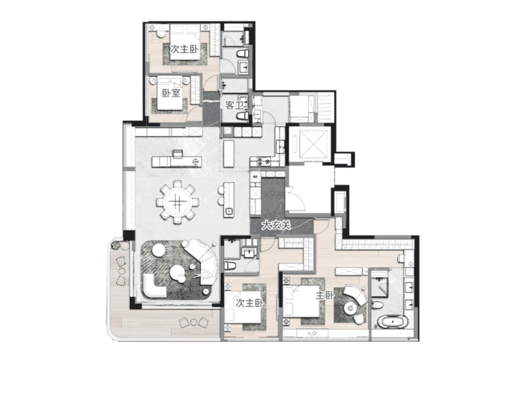 它在LDK的基础上再度升级,让餐厅、客厅、多功能厅、观江厅联合为一体,为的是让尺度更强化、格局更丰富。