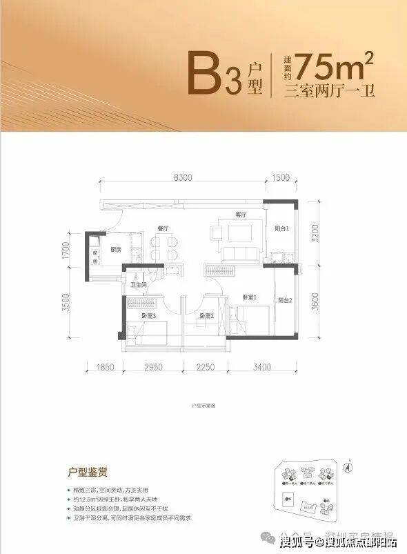 特点:LDKB一体化设计,主卧11.3㎡(含飘窗),次卧7.28㎡(含飘窗)x2。