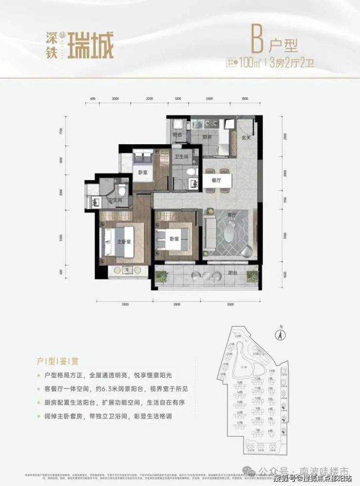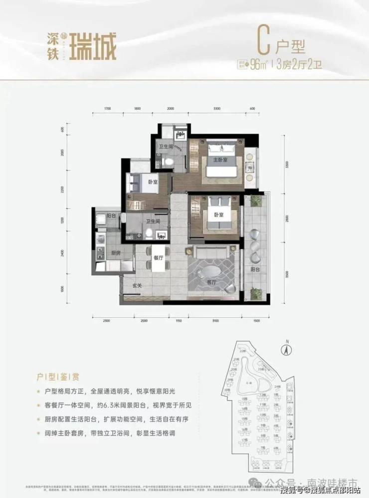 深铁瑞城,总占地面积约18.9万㎡,总建筑面积约64万㎡,计容建筑面积约57.7万㎡,容积率3.06,绿化率25%,项目共分3期开发,总规划4770户(其中商品房2770套,人才房606套,保障房1394套),停车位3202个(占比1:0.67)。