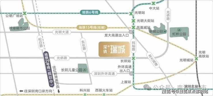 深铁瑞城,由深铁集团打造,位于光明区凤凰街道光桥路与科裕路交汇处,项目所在区位属于光明科学城产业转化区,堪称光明版的南山粤海街道,连续3年蝉联光明区GDP总量第一,在2021年GDP总量为351.9亿元,也是深圳先进制造业新高地,湾区科研经济主阵地,家门口的光侨路串联起光明云谷、科学方舟、凤凰新型产业集群、光明城TOD、华星光电产业集群、长圳TOD、玉塘新型产业集群,被称为光明版的“深南大道”。