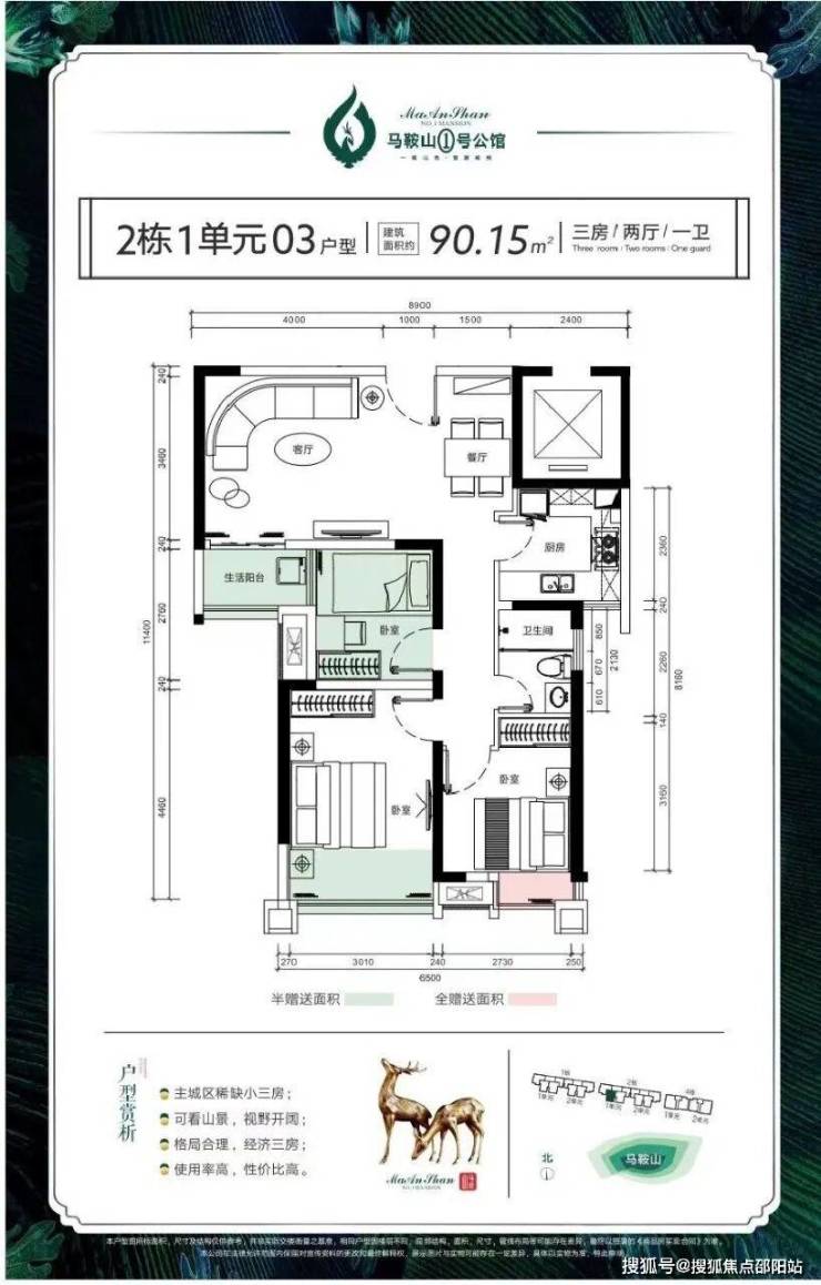 02、03户型:约90平米 3*2*1 均价:23280 元 朝南及南北通