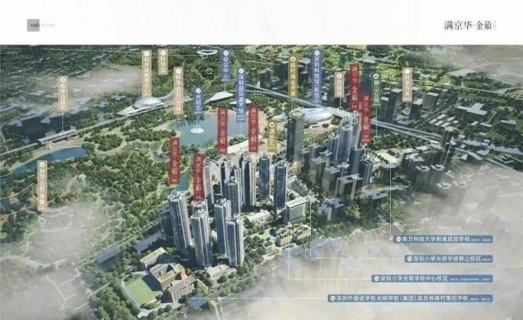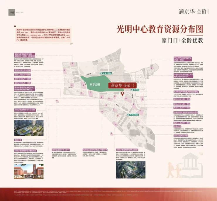满京华金硕悦府,位于深圳光明中心区核心位置,紧邻光明科学城这一国家级科技创新枢纽,坐拥科学公园首排景观(占地约208万平方米),是光明科学环廊的重要组成部分,片区定位为深圳北部新中心,依托光明科学城的科研产业规划,未来将聚集大量高端人才与资源,区域发展潜力突出。
