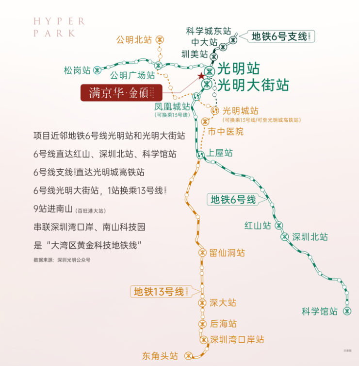交通配套:项目距6号线“光明站”约800米,步行11分钟可达。2站到凤凰城站换乘13号线,4站至光明城站接驳高铁站与6号线,6站抵宝安上屋,11站达南山西丽留仙洞,14站到南山高新园,18站至后海。此外,龙大、南光、深圳外环高速环伺,快速串联全城。