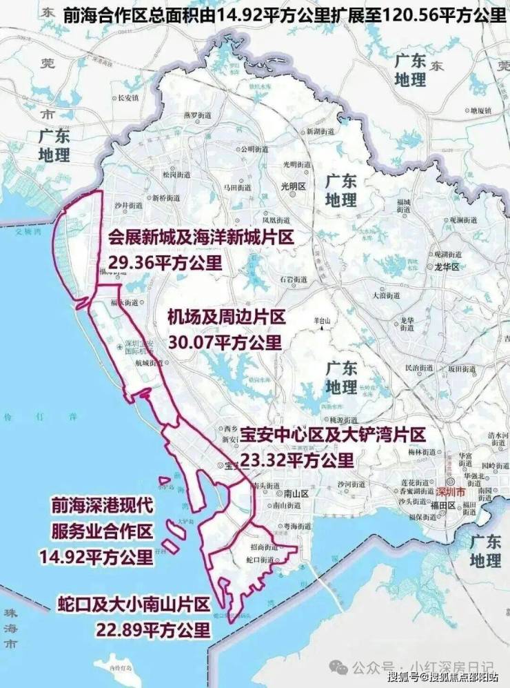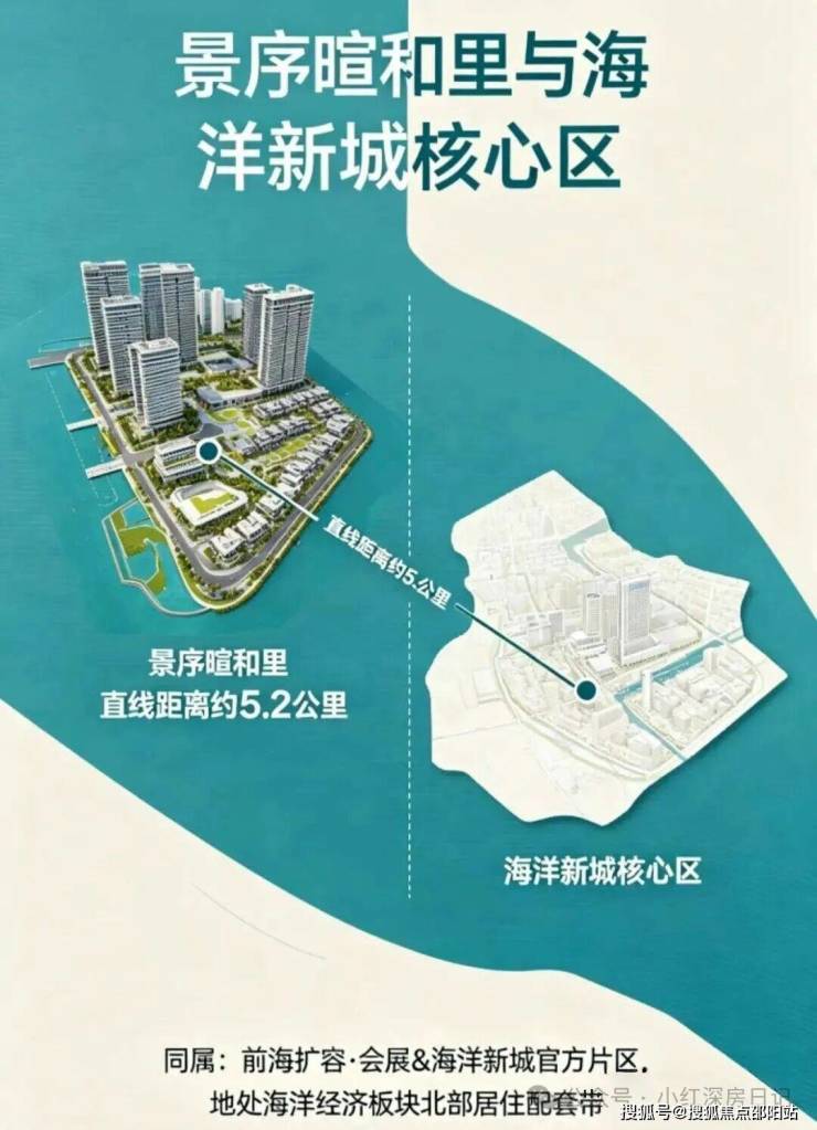 这是景序暄和里最硬的底气。项目并非蹭概念的“泛前海”板块,而是官方明确划入前海合作区120.56km²法定范围,归属会展新城及海洋新城片区(29.36km²)。
