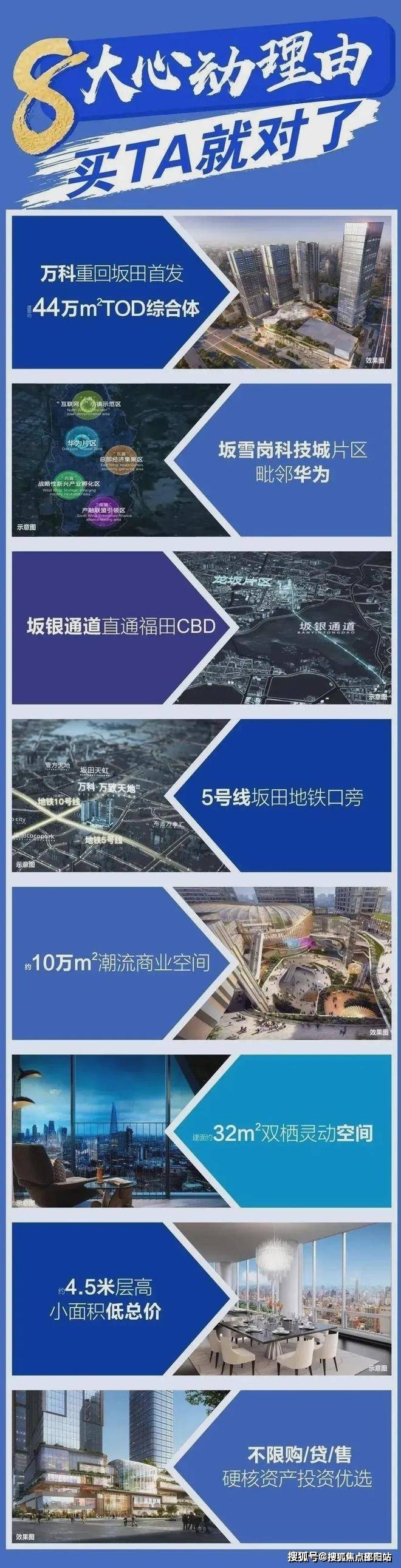 项目总建筑面积约为50万平方米,规划建设为集商业、办公、公寓等功能高度复合的商业综合体和坂雪岗科技城综合商务中心,建成后将成为集商业、办公、住宅于一体的大型城市综合体。其中主塔楼为206.9米/46层的办公楼,B栋塔楼为39层商业办公楼 建筑面积约4.03万平方米,建筑高度185.5米。售楼处电话:400-166-9557。